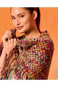 Driehoekige omslagdoek van ca 150 a 68 cm (incl. franjes). Dit patroon is gehaakte in stokjes in een waaierpatroon. Het gebruik van Lana Grossa Cotonella Multi zorgt voor een zijdezacht, ademend resultaat met schitterend kleurverloop.