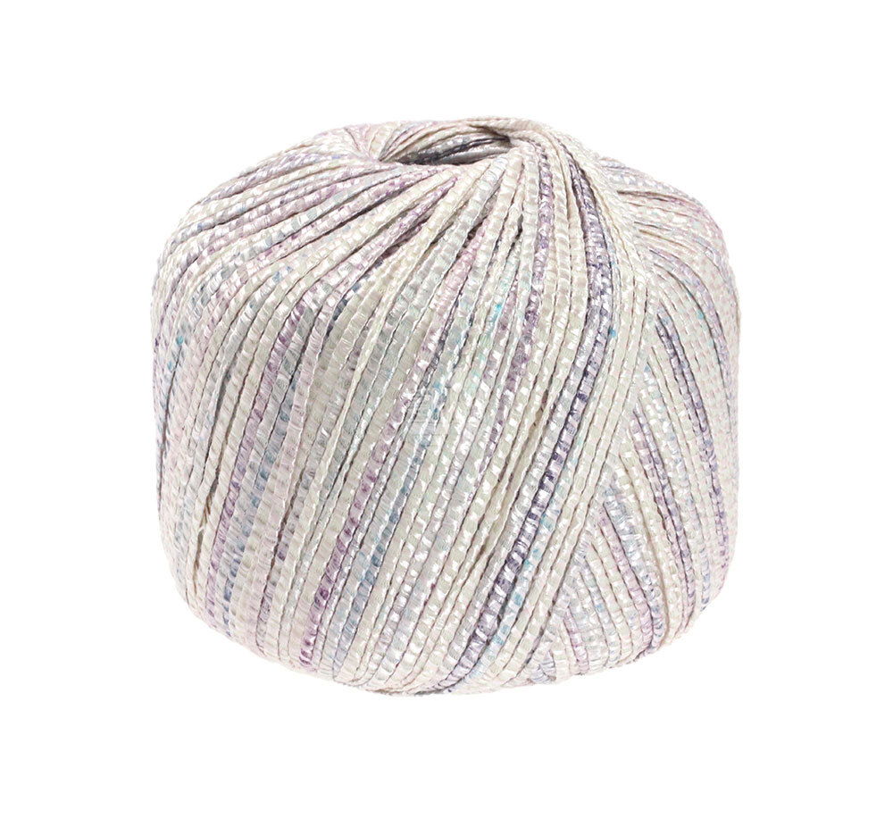 Lana Grossa Alessia 02 creme roze blauw heeft een witte katoenen basis die omwikkeld is met een polyamide draad. De recyclede polyester draad steekt in kleur af tegen de witte basis. Dit geen je brei- en haakwerk een luxe uitstraling.