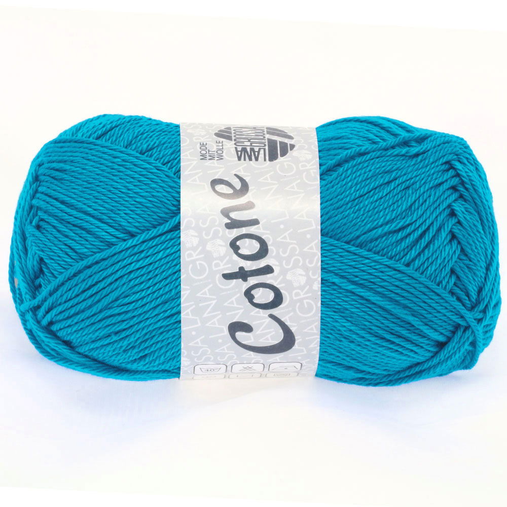 Lana Grossa Cotone 010 donker aqua blauw is een 100% glanskatoenen draad, ideaal om mee te haken en te breien. Het garen is geschikt voor dames-, heren- en kinderenkleding, poppen, knuffels en amigurumis. Het Cotone katoen is in zeer veel kleuren verkrijgbaar, waardoor er prachtige kleurverlopen kunnen worden gemaakt en ieder project een specifieke kleur kan krijgen.