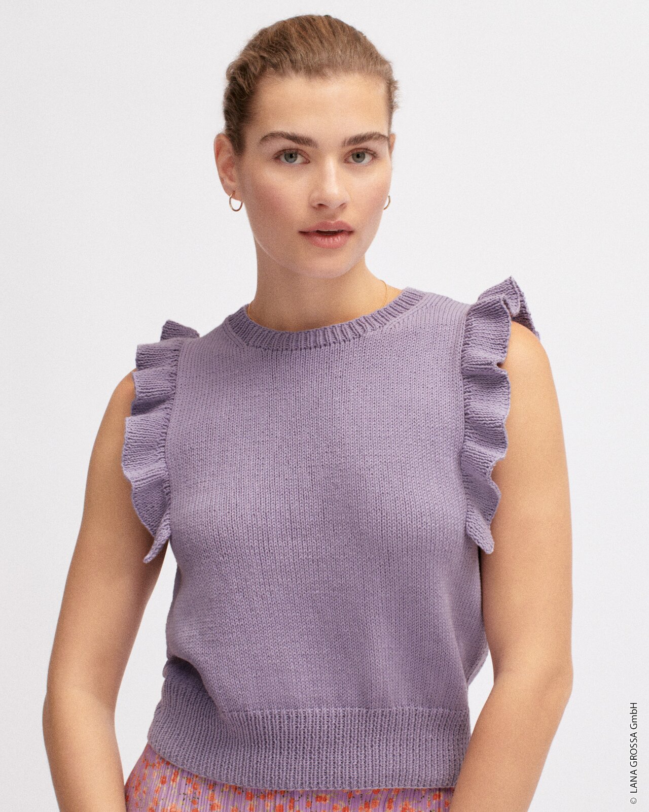 Damestop met ruches op de schouders gemaakt van Lana Grossa Elastico