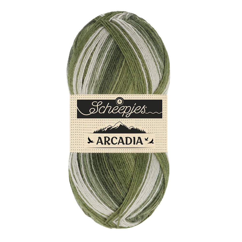 Scheepjes Arcadia is een prachtig sokkengaren, geïnspireerd op indrukwekkende landschappen van over de hele wereld. Het is een slijtvast garen van 75% superwash scheerwol en 25% polyamide in zelfstrepende en effen kleuren. Het garen is warm en heeft de ademende kwaliteit van wol, maar is dankzij de polyamide slijtvast en onderhoudsvriendelijk. Arcadia heeft een geweldige stekendefinitie, voelt licht rustiek aan en wordt tijdens het verwerken zachter. De collectie van Scheepjes Arcadia biedt zowel zelfstrepende als effen kleuren, wat tal van mogelijkheden geeft in het samenstellen van uw zelfgebreide lievelingssokken. Brei bijvoorbeeld een zelfstrepende sok met een effen hiel en tenen. Arcadia is natuurlijk ook geschikt voor allerlei kledingstukken en accessoires, zoals truien en sjaals.