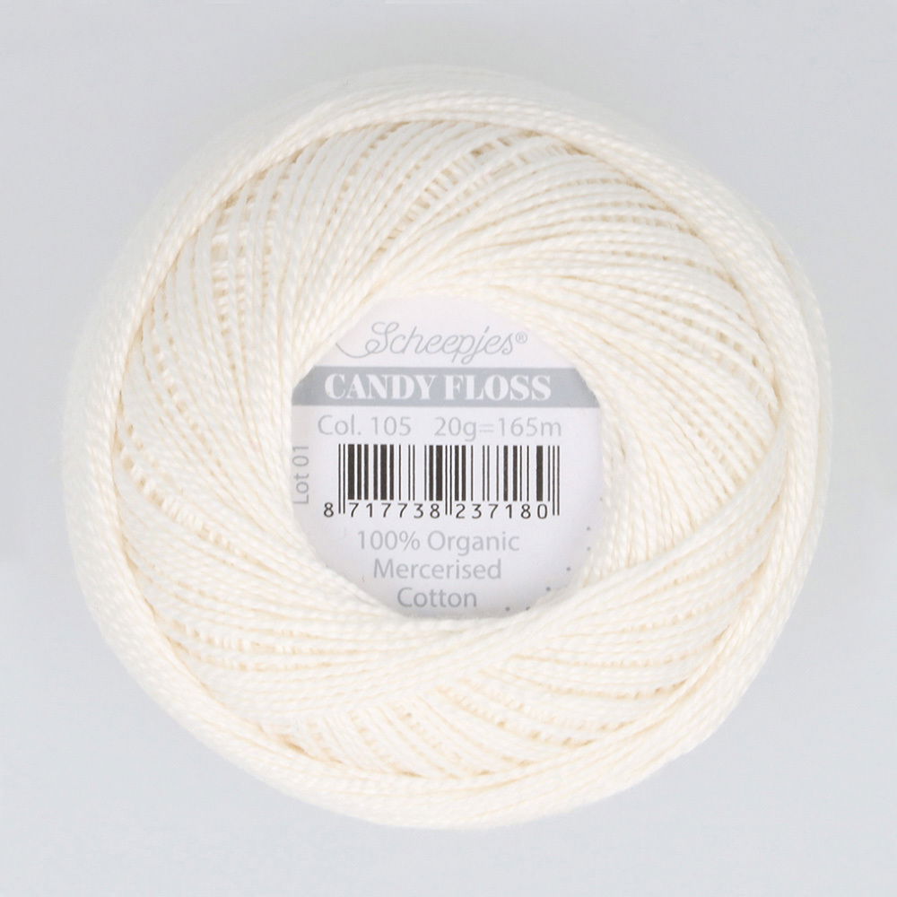 Scheepjes Candy Floss 20gr - 105 Bridal White, het garen is gemaakt van 100% biologisch gemerceriseerd katoen. Het garen heeft een hoge twijning en een prachtige glans, wat zorgt voor mooie gedefinieerde steken in je werk. Het garen splijt niet en is geschikt voor uiteenlopende technieken en projecten, zoals borduren, Sashiko, frivolité, handquilten, micro-haakprojecten zoals amigurumi en sieraden of het aanbrengen van gehaakte randen aan dekens, accessoires en kleding.