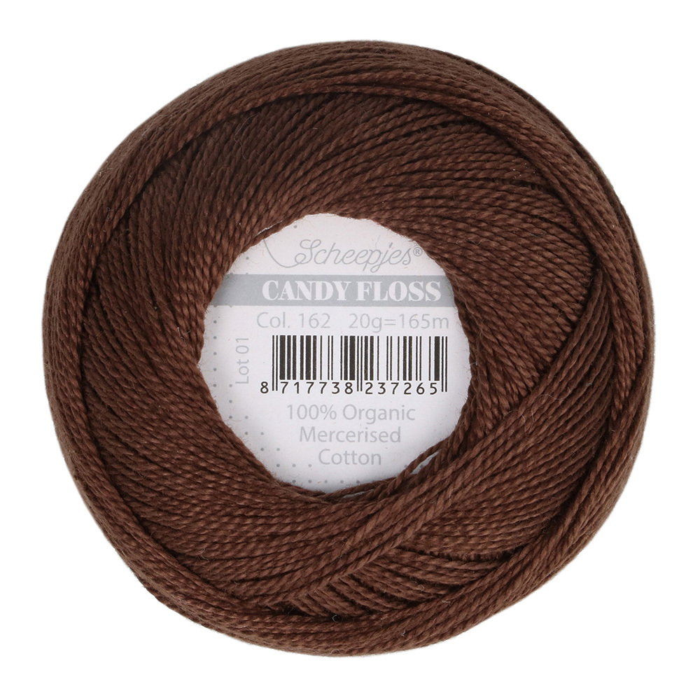 Scheepjes Candy Floss 20gr - 162 Black Coffee, het garen is gemaakt van 100% biologisch gemerceriseerd katoen. Het garen heeft een hoge twijning en een prachtige glans, wat zorgt voor mooie gedefinieerde steken in je werk. Het garen splijt niet en is geschikt voor uiteenlopende technieken en projecten, zoals borduren, Sashiko, frivolité, handquilten, micro-haakprojecten zoals amigurumi en sieraden of het aanbrengen van gehaakte randen aan dekens, accessoires en kleding.