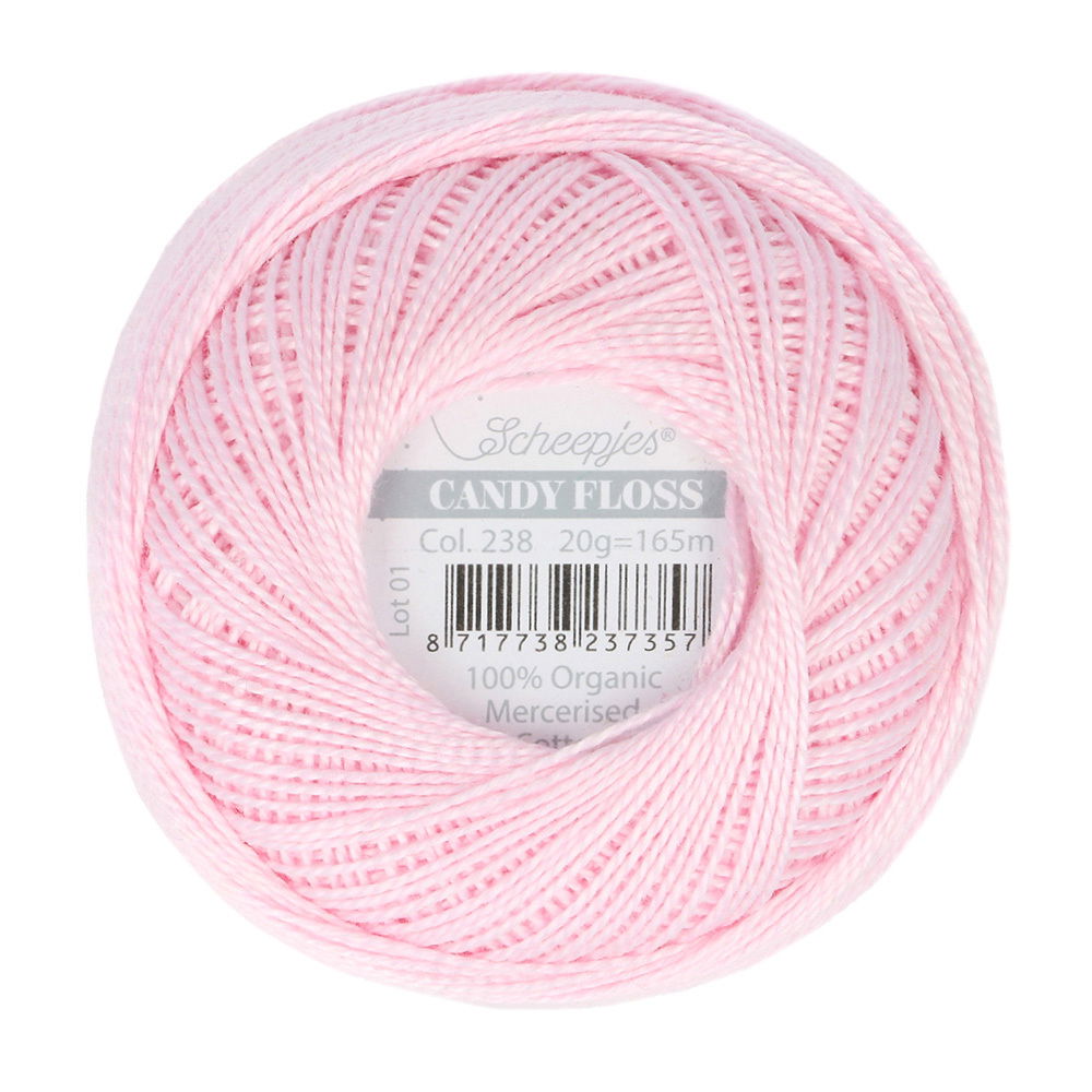 Scheepjes Candy Floss 20gr - 238 Powder Pink, het garen is gemaakt van 100% biologisch gemerceriseerd katoen. Het garen heeft een hoge twijning en een prachtige glans, wat zorgt voor mooie gedefinieerde steken in je werk. Het garen splijt niet en is geschikt voor uiteenlopende technieken en projecten, zoals borduren, Sashiko, frivolité, handquilten, micro-haakprojecten zoals amigurumi en sieraden of het aanbrengen van gehaakte randen aan dekens, accessoires en kleding.