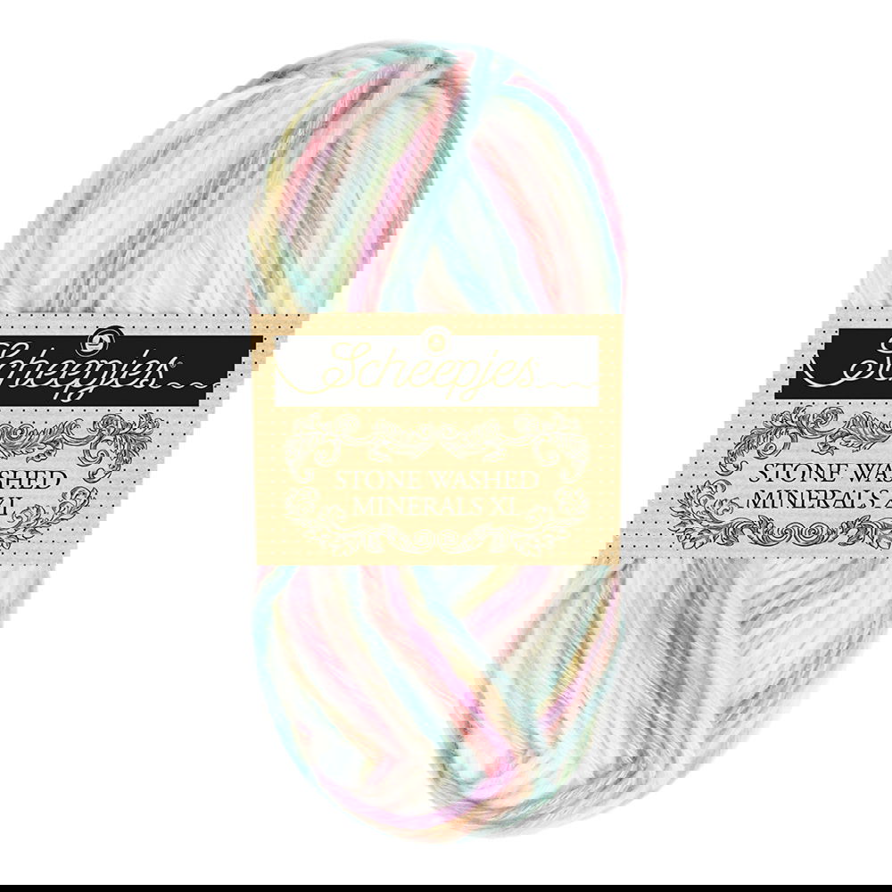 Scheepjes Stone Washed Minerals XL is een variatie op het vertrouwde Scheepjes Stone Washed XL. Hetzelfde zijdezachte garen, maar dan met een prachtig gemêleerd effect. Het karakteristieke Stone Washed uiterlijk komt door de unieke productiemethode van dit garen: in een netje van ecru-kleurig katoen worden kleurige en donzige acrylvezels geblazen. Het garen heeft de ademende kwaliteit van katoen, maar is dankzij het acryl sterk en gemakkelijk in onderhoud. Die combinatie maakt Scheepjes Stone Washed Minerals XL ideaal voor de meest uiteenlopende brei- en haakprojecten en bovendien geschikt voor elk seizoen.