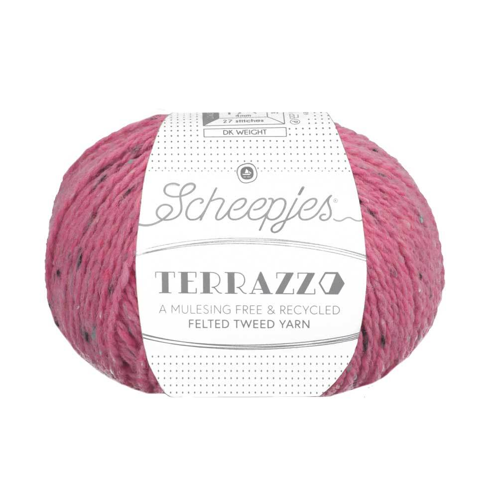 Scheepjes Terrazzo is een volledig gerecyclede wol- en viscosemix. Het garen heeft een luxe uitstraling met een subtiel gespikkeld kleureffect dat doet denken aan terrazzo (granito) vloeren. Het gespikkelde effect wordt bewerkstelligd door de vezelpropjes in contrasterende en complementerende kleuren die in deze tweedwol zijn mee getwijnd. Scheepjes Terrazzo profiteert van de ademende kwaliteiten van zowel wol als viscose en combineert daarnaast het beste van die twee. Dankzij de viscose voelt het garen zijdezacht aan, is het vocht absorberend, valt het mooi, heeft het een rustieke uitstraling en is het licht van gewicht. Terwijl de wol het heerlijk warm maakt. Het garen is zowel geschikt voor gebreide als voor gehaakte kledingstukken, woonartikelen en accesoires zoals mutsen en sjaals. Combineer het eens met de Alpaca Rhythm en Mohair Rhythm garens voor een verrassend textuurexperiment.
