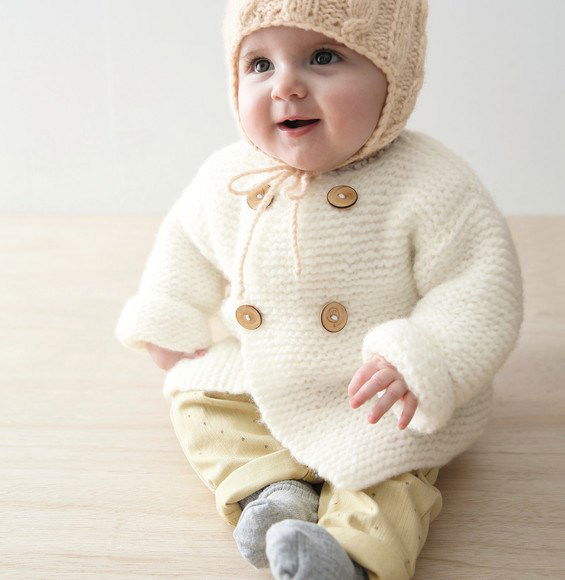 Phildar breipatroon babyvestje met dubbele knoopsluiting. Dit jasje in ribbelsteek is gemaakt van het garen Phil Nuage.