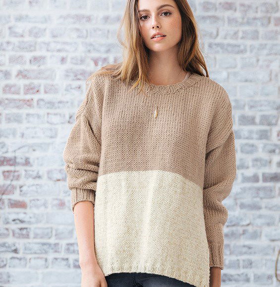 Breipatroon damestrui met ronde hals, gemaakt van Phildar Partner 6 en Phil Brillant.