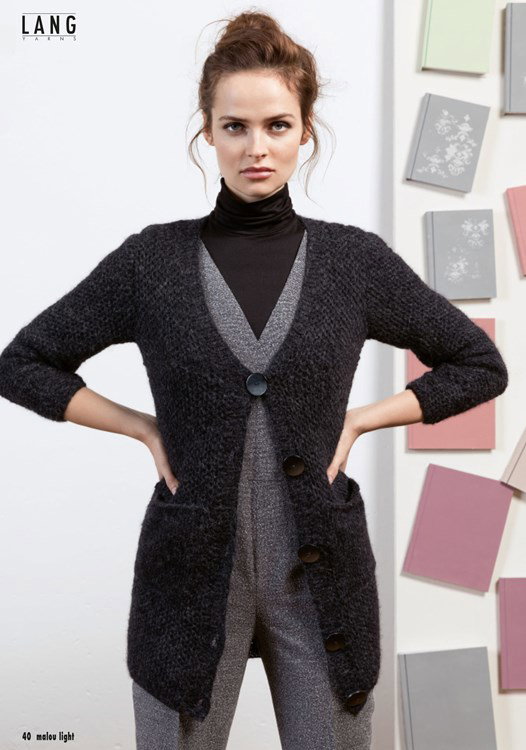 Breipatroon damesvest met grote knopen en zakken. Gemaakt van het Lang Yarns garen Malou Light.