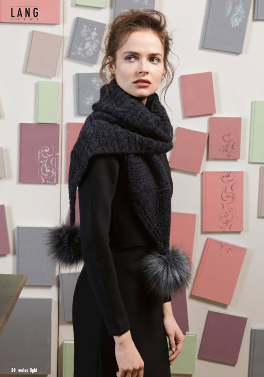 Breipatroon damessjaal met driehoeken. Eventueel met twee pomponnen. Van het Lang Yarns garen Malou Light.