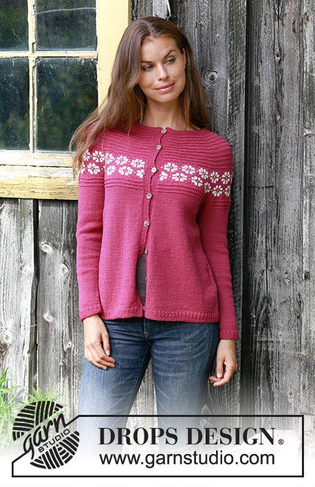 Daisy Delight Cardigan, breipatroon dames vest met inbreipatroon van madeliefjes. Het vest is gebreid in ribbelsteek van het DROPS breigaren Baby merino.