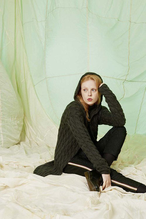 Breipatroon damesvest met capuchon. Het is vest is gemaakt van Lang Yarns Stockholm in kabelsteek.