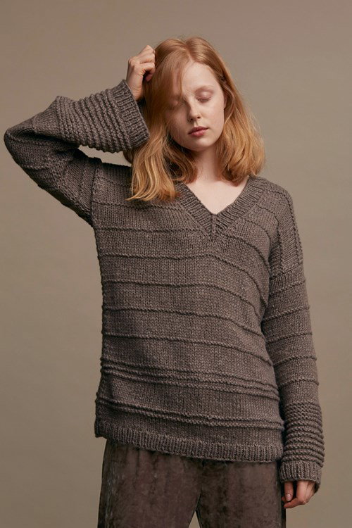 Lang yarns breipatroon touch of taupe, damestrui met V-hals. Deze trui met ingebreide strepen is gemaakt van het garen Lang yarns wooladdicts earth.
