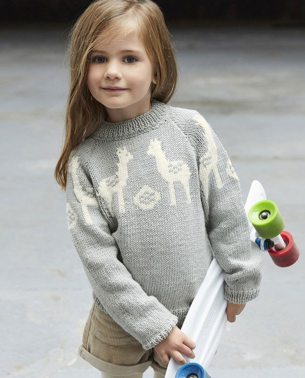 Phildar breipatroon meisjestrui Ambre met inbreipatroon alpaca, van het garen Phil Irlandais.