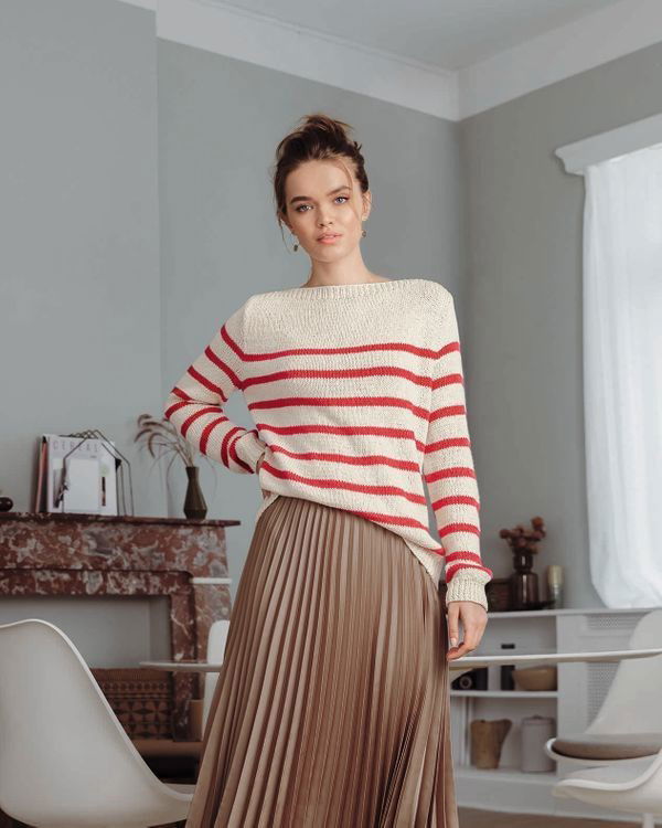 Phildar breipatroon damestrui met rechte halslijn. Deze gestreepte trui is gemaakt van het garen Phil rustique.