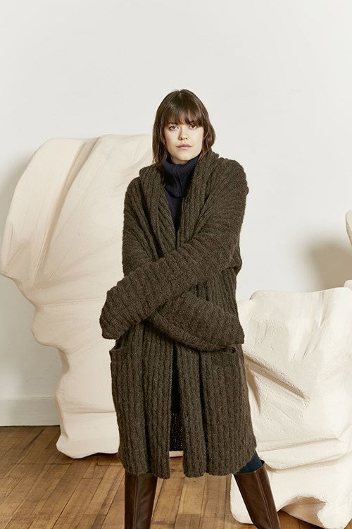 Breipatroon lange damesmantel / vest met zakken aan de voorkant. Het vest is gebreid van het garen Lang Yarns Malou Light 887.