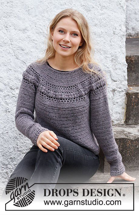 DROPS haakpatroon Tree Hive Sweater. Iets uitlopende damestrui gehaakt in ronde pas en kussensteken. De trui wordt gehaakt met het garen DROPS Sky.