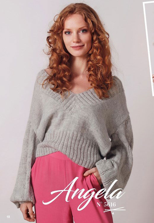 Lammy breipatroon korte damestrui met wijde V-hals en ballonmouwen. Deze trui met brede taille en halsboord is gemaakt van het mohair garen Lammy Angela. Patroon beschikbaar in de maat 34 - 44