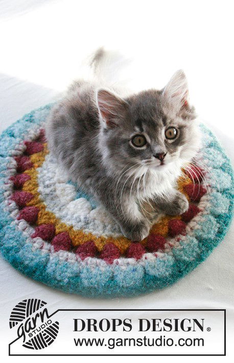 Geef je kat het comfort dat ze verdient met de 'Middelpunt van de Aandacht' mat van Drops! Deze gehaakte en gevilte mat, gemaakt met 2 draden DROPS Snow, biedt een knusse en warme plek voor je kat om op te liggen. Het ontwerp wordt gehaakt vanaf het midden naar buiten toe, wat zorgt voor een mooi en stevig resultaat.