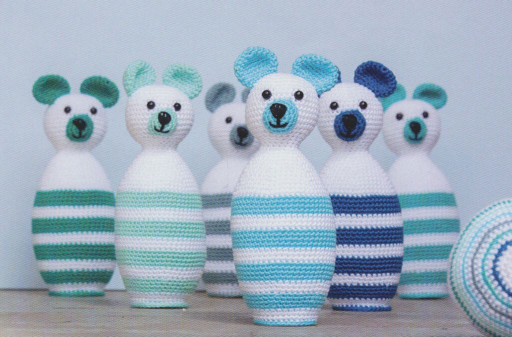 Haakpatroon kegelspel met rinkelend geluid. De berenkegels zijn gehaakt van het garen Scheepjes Catona.