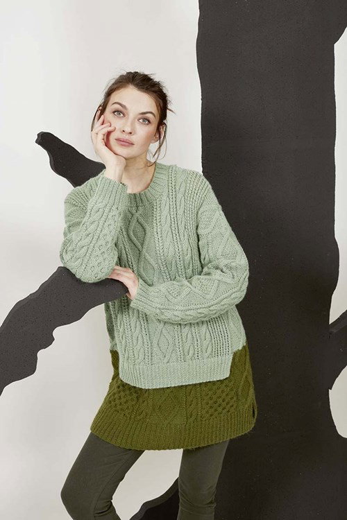 Breipatroon saliekleurige damestrui met kabels, met aan de onderkant olijfgroen. De trui is gemaakt van het garen Lang Yarns Aymara.