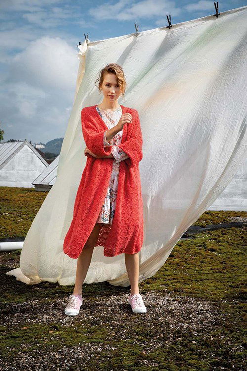 Breipatroon damesvest met prachtig ajourpatroon. De mouwen zijn omgeslagen en vastgezet, maar kunnen natuurlijk ook lang blijven. Het vest is gebreid van het garen Lang Yarns Superlight 749.