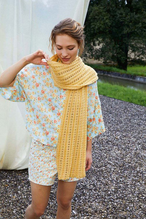 Breipatroon sjaal met fantasiepatroon. De sjaal is gebreid van het garen Lang Yarns Liza 1069. Afmeting: circa 36 x 170 cm.
