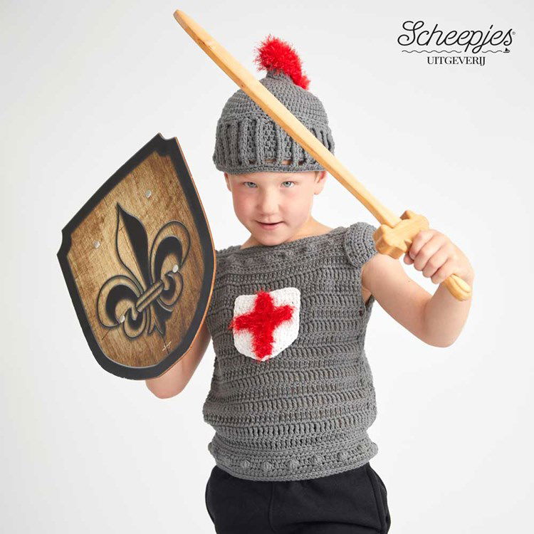 Haakpatroon ridder verkleedset, gemaakt van Scheepjes Cahlista en Scheepjes Panda. Geschikt 6 jaar.