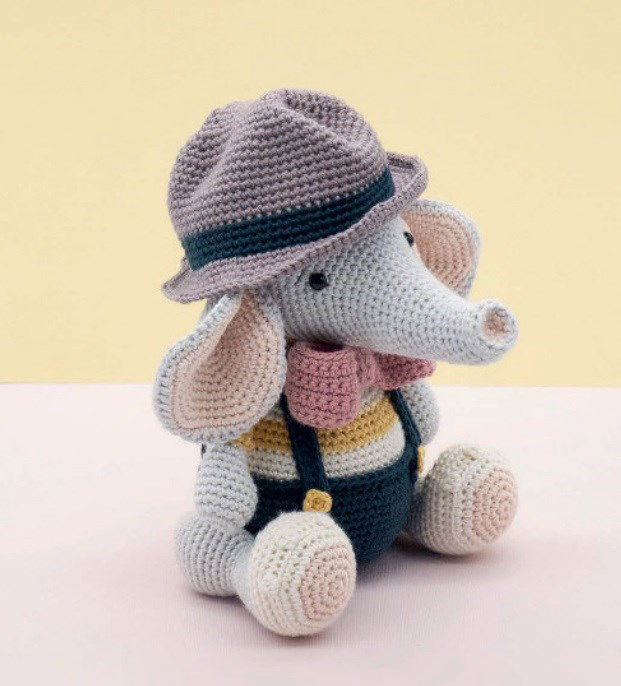 Haakpatroon Doki de olifant. Doki is een gevoelige ziel die de hele wereld rondreist en overal nieuwe vrienden maakt. Doki is gemaakt van Phildar Coton 3.