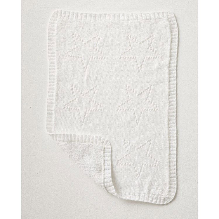 Phildar breipatroon babydeken met inbreipatroon van sterren. Dit gebreide dekentje is gemaakt van de garens Phildar Caresse en Phildar Baby Doll, hij is circa 45 x 70 cm groot.