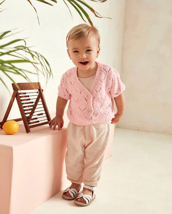 Breipatroon kindervestje Carmen met ajourpatroon en korte mouw. Het vestje is gebreid van het Phildar garen Phil Baby Doll.
