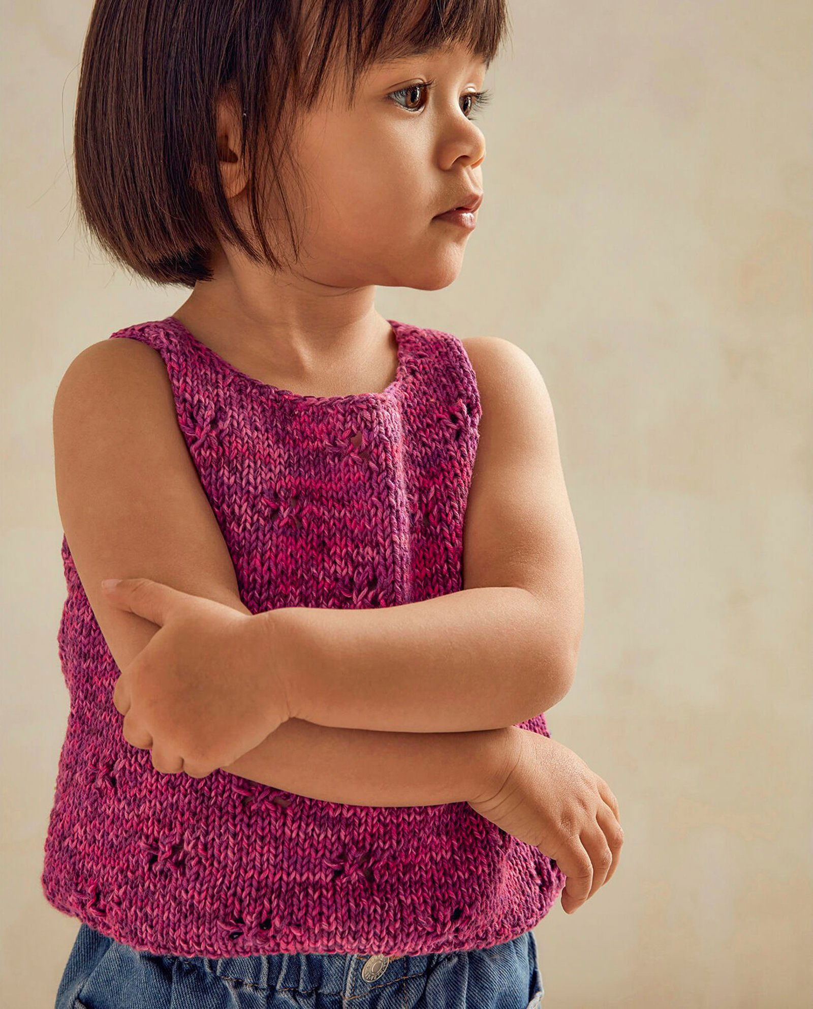 Breipatroon kinderhemdje Celiane met fantasiesteek. Het topje is gebreid van het Phildar garen Phil Rainbow. Langs de halsopening en de armsgaten wordt een rij gehaakt.