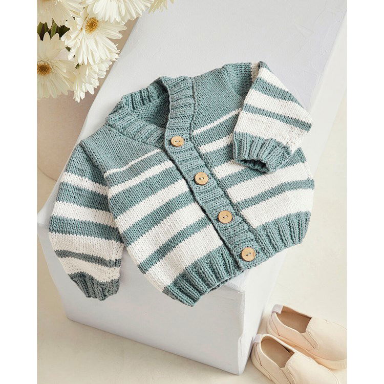 Breipatroon kindervest Cyrill in gestreepte tricotsteek en boordsteek. Het vestje is gebreid van het Phildar garen Phil Green.