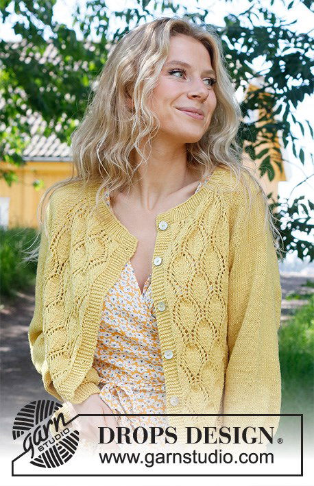 Breipatroon damesvest Queen Bee Cardigan met raglan mouw en kantpatroon. Het vest is gebreid van het garen Drops Baby Merino.