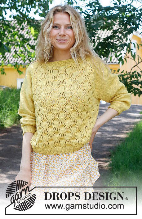 Breipatroon damestrui Queen Bee met raglan mouw en kantpatroon. De trui is gebreid van het garen Drops Baby Merino.