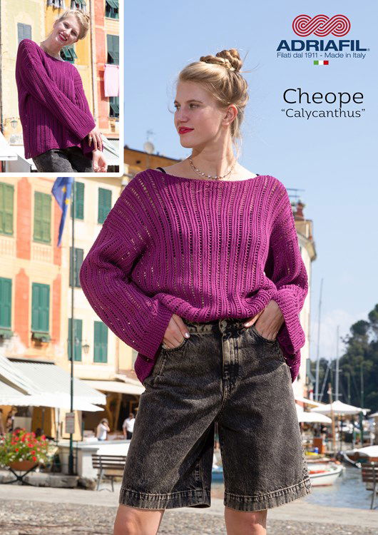 Adriafill breipatroon damestrui met wijde hals en verticaal ribbelpatroon. Deze trui is gebreid in fantasiesteek van het garen Adriafill Cheope.