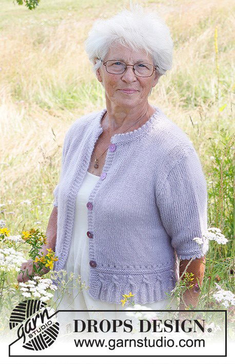 Garnstudio breipatroon Purple Cardigan, damesvest met ronde hals en muizentandrand langs mouw en halslijn. Dit zachte vest is gemaakt van de garen DROPS Alpaca en DROPS Kid-Silk.