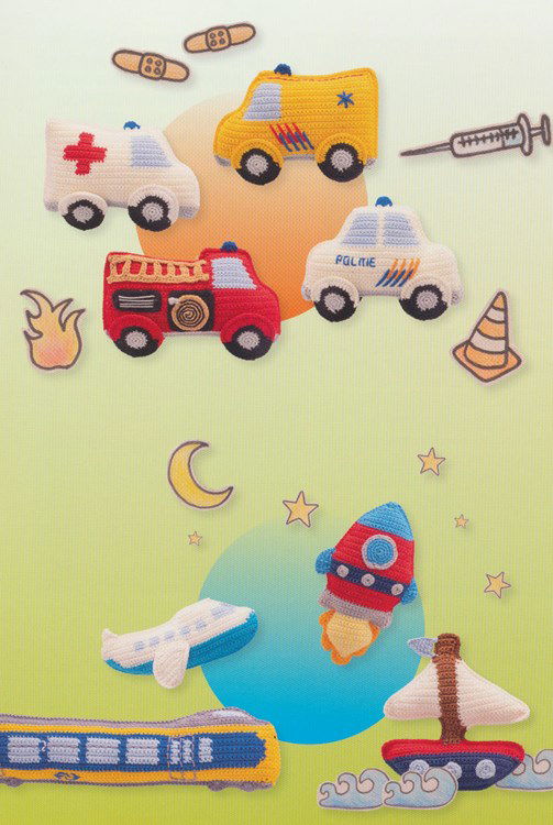 Haakpatroontje voor het haken van verschillende voertuigen. Deze platte haakwerkjes zijn leuk om mee te spelen, als versiering of hangers.