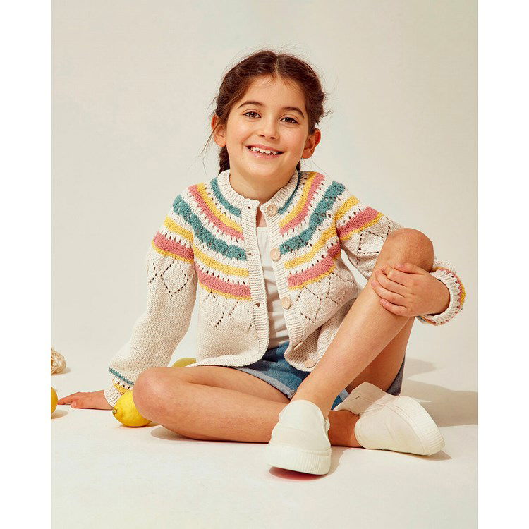 Phildar breipatroon Dalila, meisjesvest met knoopsluiting. Dit vrolijke vest met ajourpatroon is gemaakt van de garens Phil Cabotine en Baby Doll.