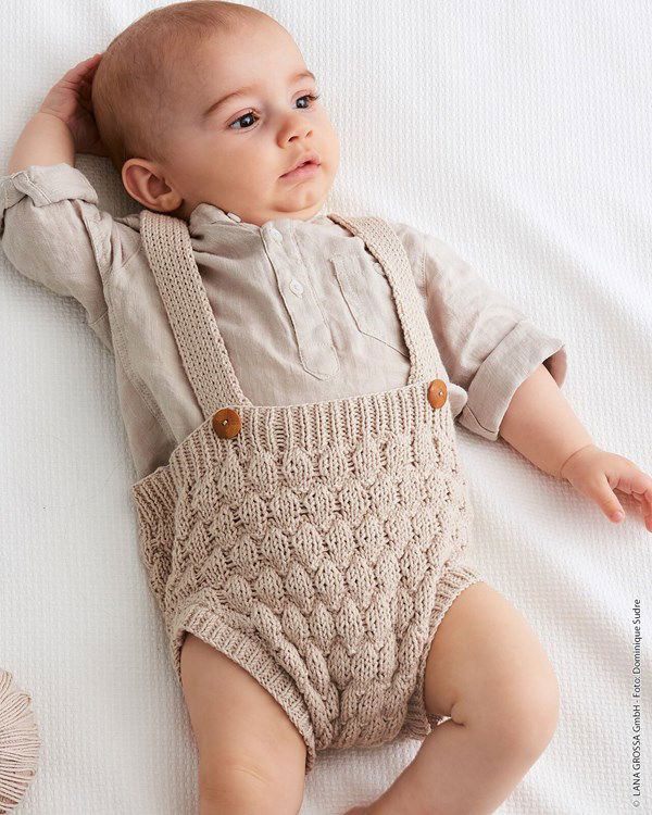 Lana Grossa breipatroon babybroekje zonder pijpjes. Dit broekje is gebreid in ovaal noppenpatroon van het garen Lana Grossa Elastico.