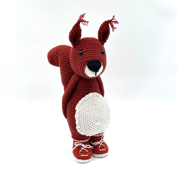 Haakpatroon voor Rusty de eekhoorn in Scheepjes Softfun en Catona. Rusty heeft pluimpjes op zijn oren en schoenen aan zijn voeten. Hij is ca 28 cm groot, door zijn grote staart kan hij helaas niet goed zelf staan.
