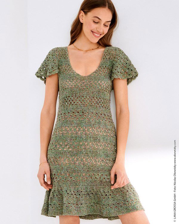 Lana Grossa haakpatroon aansluitende damesjurk met wijde onderrand en mouwen. Dit in kantpatroon gehaakte jurkje is gehaakt van het garen Lana Grossa About Berlin Spotty.