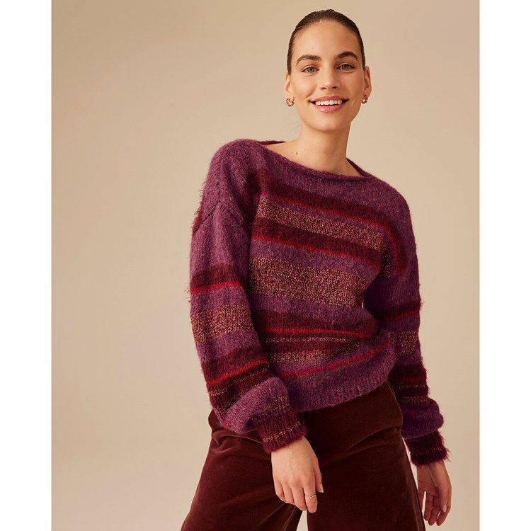 Phildar breipatroon Geraldine, damestrui met aansluitende mouwmanchetten. Deze trui is gebreid van de garens Phil Givre, Disco, Beuagency en Diamant.