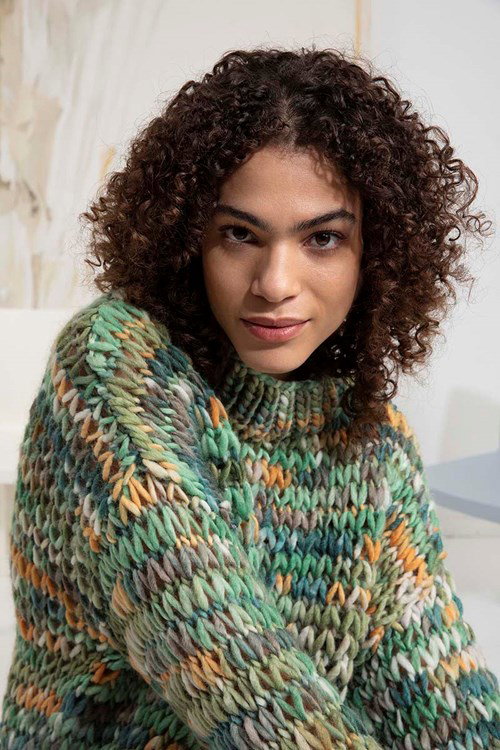 Breipatroon lange en wijde damestrui, gebreid op pen 9 en 12 van het garen Lang Yarns Bold Color. De trui kan ook prima gedragen worden met een legging!