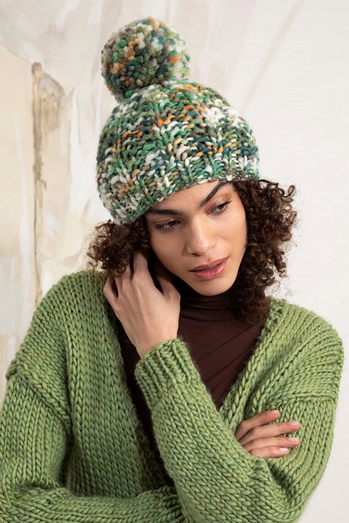 Breipatroon grofgebreide muts in een damesmaat. De muts is gebreid van het Lang Yarns garen Bold Color.