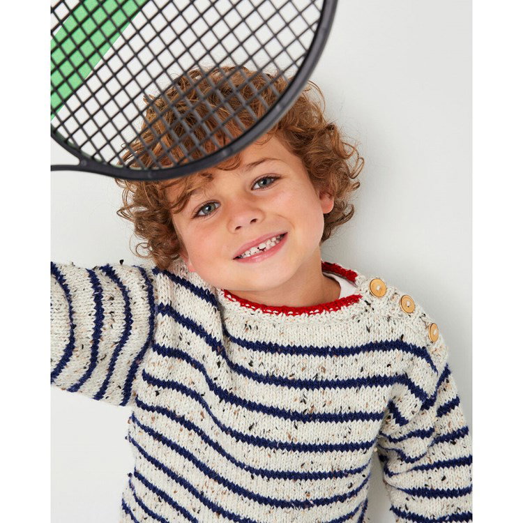 Phildar breipatroon Jerome, kindertrui met een rood randje langs de halslijn. Deze kindertrui is in tricotsteek gebreid van het gemêleerde garen Phil Randonees en Partner 3,5.