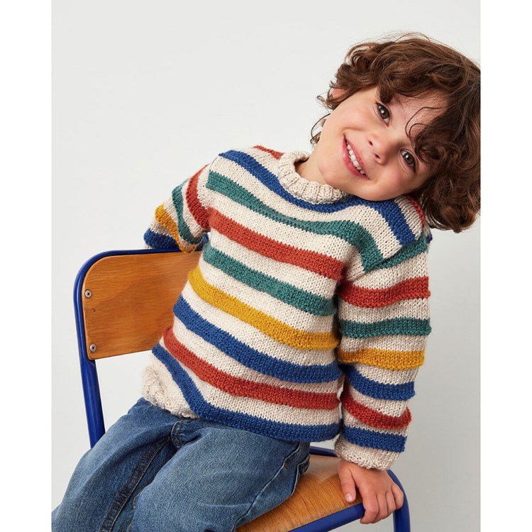 Phildar breipatroon Joseph, kindertrui met gekleurde strepen, welke door een ribbelsteek zijn geaccentueerd. Deze vrolijke en eenvoudig te breien trui is gemaakt van het garen Phil Sport.