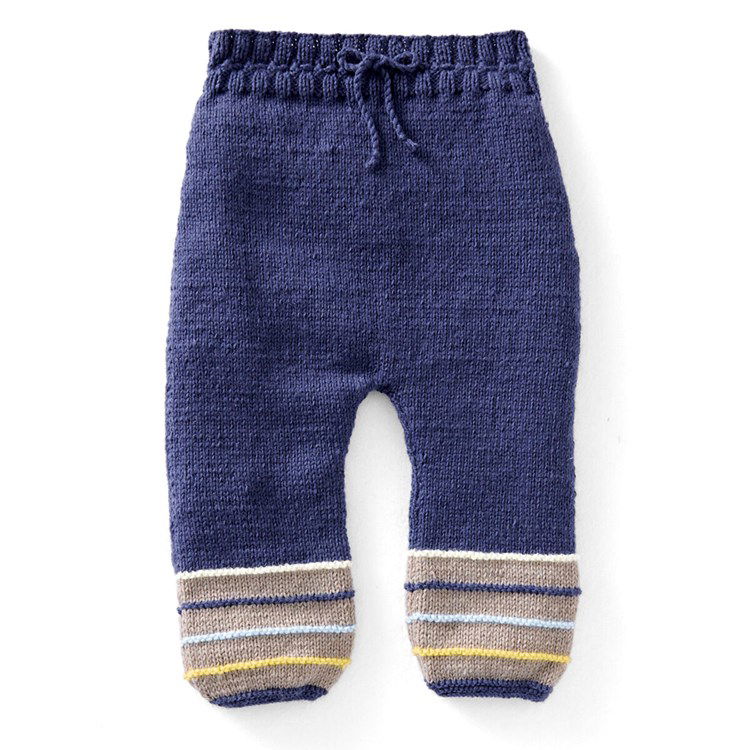 Phildar breipatroon Leonce, lange broek met gestreepte onderkant. Dit kinderbroekje is gebreid in tricot- en ribbelsteek van het garen Phildar Phil Partner 3,5.