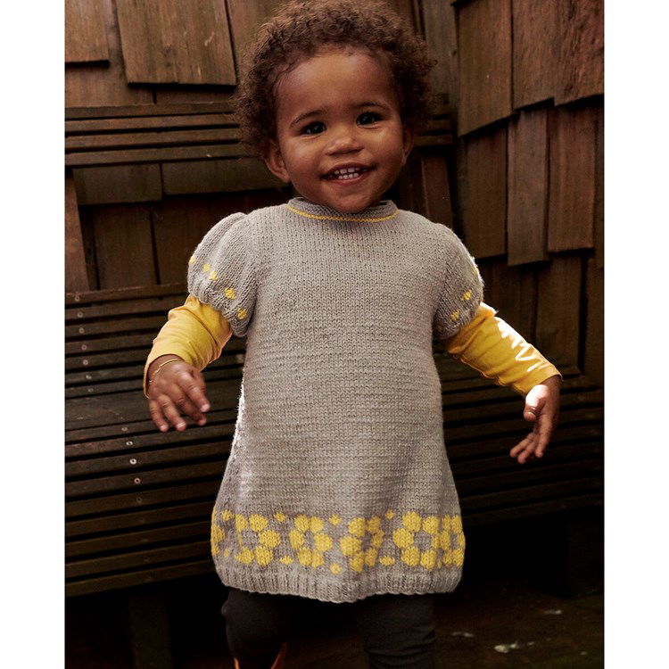 Phildar breipatroon Lilou, jurkje met nopjes in korte pofmouwen en gestileerd bloemenpatroon in onderrand. Dit A-lijn jurkje is gemaakt van het garen Phildar Phil Partner 3,5.