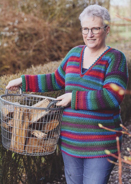 Haakpatroon vrolijke goede bui trui, een ontwerp van Wendy van Delden. Deze damestrui met langs de V-hals en onderrand een muizetandrandje. Het Scheepjes Wanderlust garen is meerkleurig, aan en afhechten van verschillende kleuren is hierdoor niet nodig.